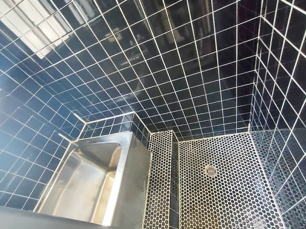 洗面台のぐるりは大きめのブラックタイルで囲まれており