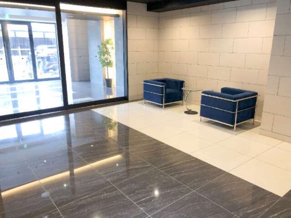 グレー×ホワイトな高級感あるエントランスロビーです。