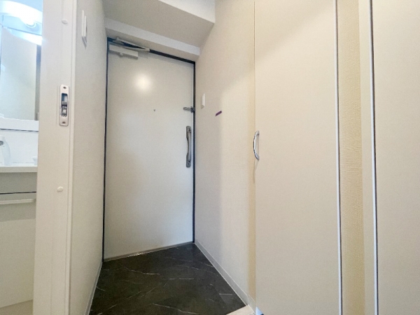 石材風タイル壁とダークグレーの床タイルがお洒落なエントランスです。