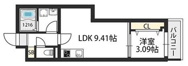 9.41帖のLDKに3.09帖の洋室からなる間取り。