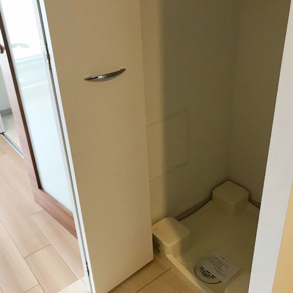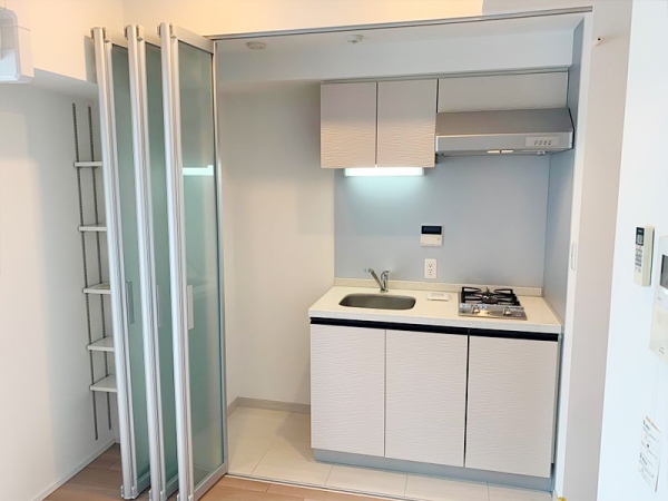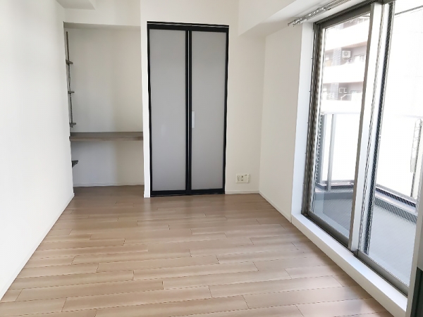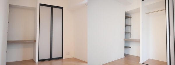 部屋にはクローゼットがあり、その隣には収納棚もあります。