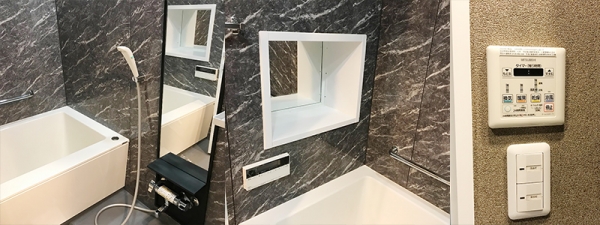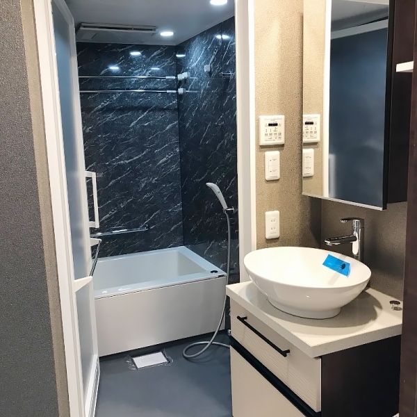 角度を変えてみると、隣にはシックなバスルームがあります。