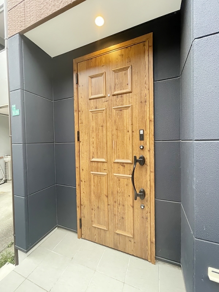 玄関扉は立派でおしゃれなウッド作り。