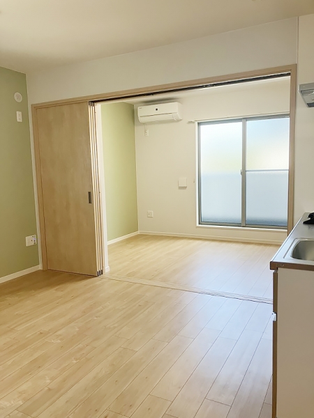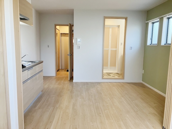 LDKは8帖。キッチンがあり、側面には窓も2つ付いてます。