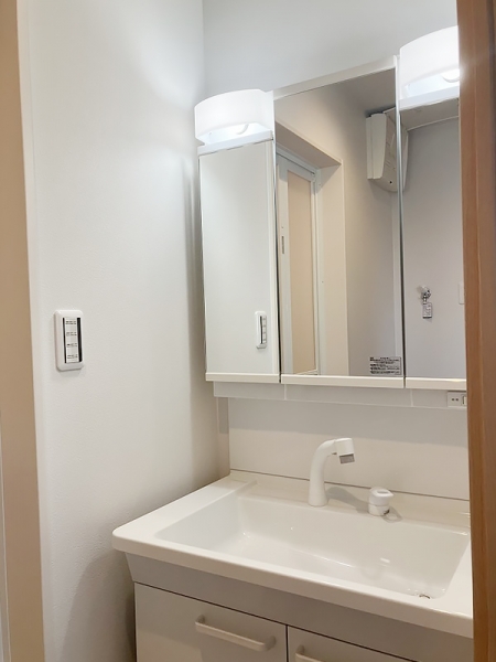 洗面台は三面鏡仕様で裏には小物収納も豊富に付いてます。