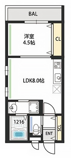 8帖のLDKと4.5帖の洋室からなる間取りで