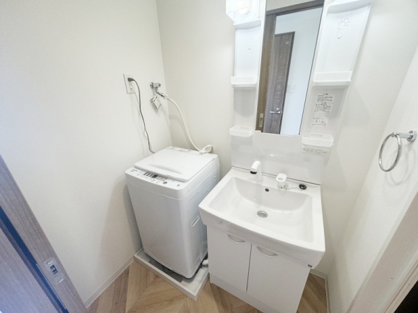 シャンプードレッサーの独立洗面台と洗濯機が並んでます。