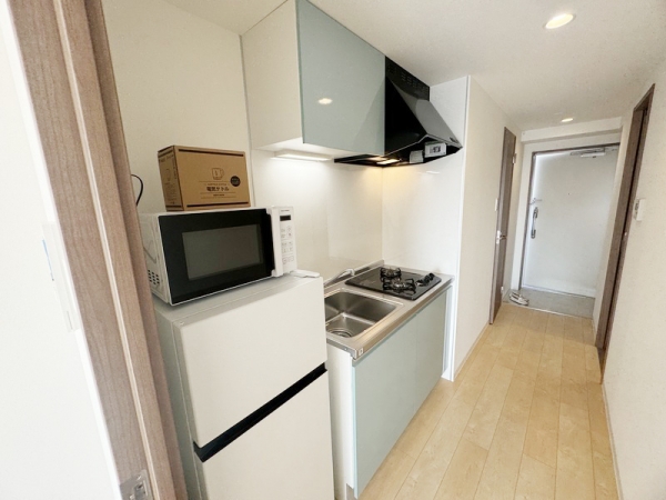 キッチンにはすでに冷蔵庫や電子レンジ等も並んでおり