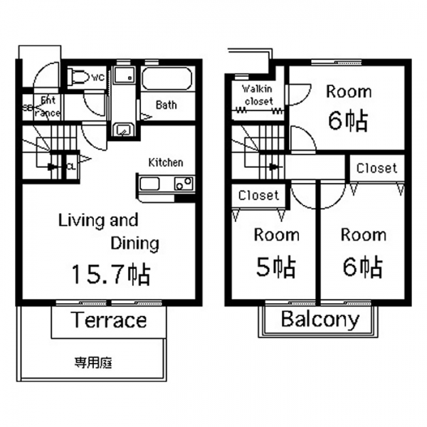 1F15.7帖のLDKと2Fに5帖と6帖の洋室3つという間取り。