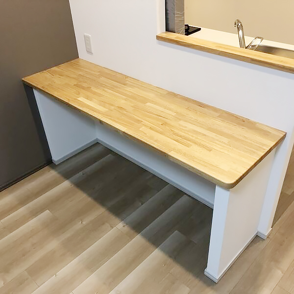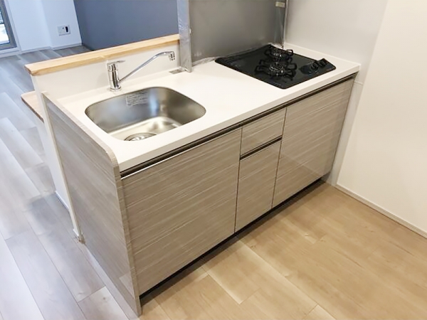 ウッド調のボディに白い天板のかわいいキッチンです。