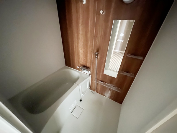 バスルームは側面がウッド調でおしゃれ。
