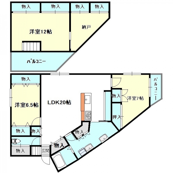 LDK20帖、洋室が12帖、7帖、6.5帖の3部屋に