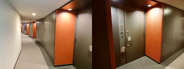 グレーとオレンジのコントラストが美しい共用廊下。