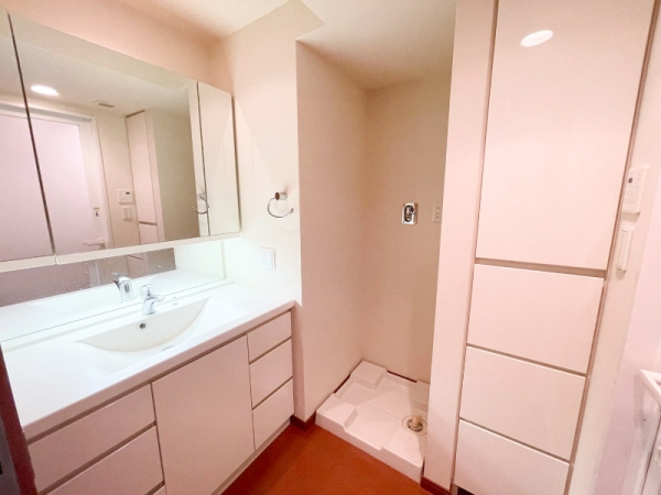 洗濯機置き場と収納棚も完備されています。