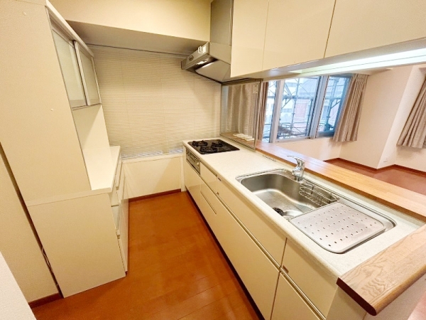 広々したキッチンで、背面側にも食器棚が設置してあるのもポイント◎