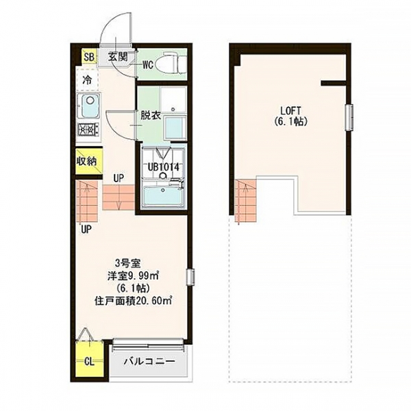 キッチンと洋室6帖+ロフト6帖のお部屋。