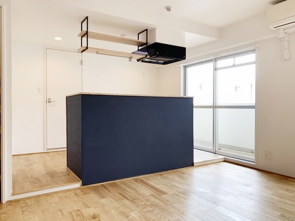 空間全体に開放感があり、キッチンのネイビーも
