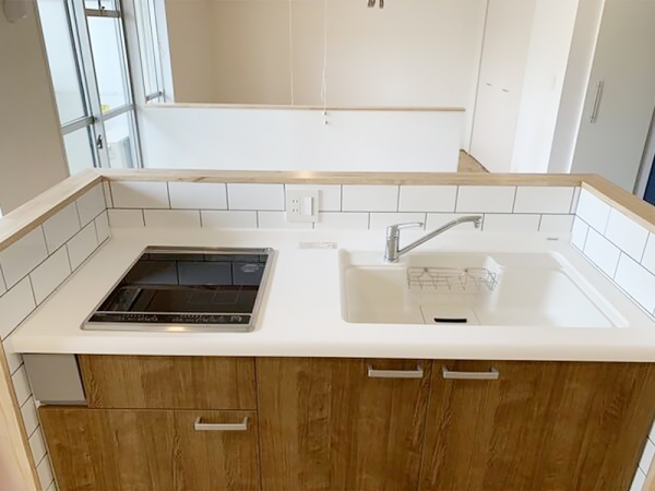 キッチンは大判タイルに囲まれ、