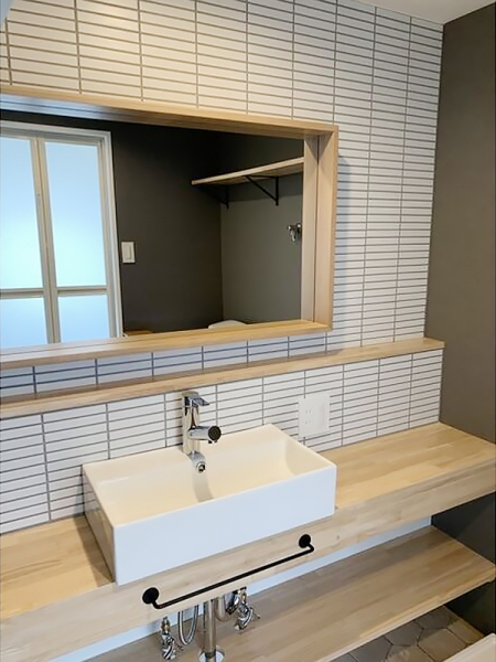 ワイドなミラーと背面のタイルが調和し、