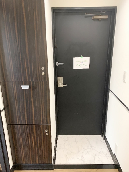 玄関には重厚感のあるブラックドアと木目の収納棚を配置。