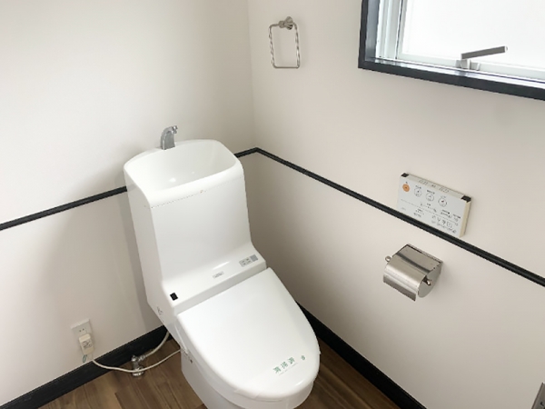 トイレはタンク一体型で手洗い機能付きのスマート仕様。