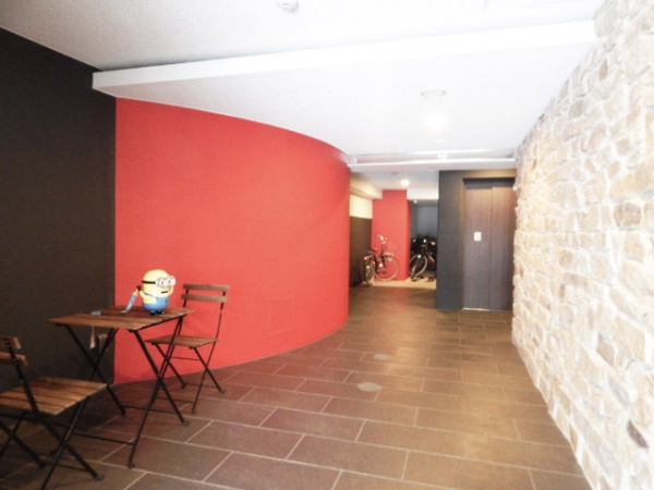 石調の壁と赤黒のアクセントカラーが印象的な明るいエリア。