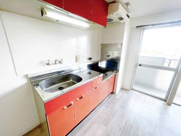 鮮やかなアクセント赤が映えるキッチンです。