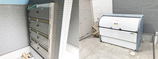 敷地内には専用ゴミ置き場と集合ポストが並びます。