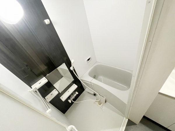 鏡や棚も付いたシンプル&機能的なバスルームです。