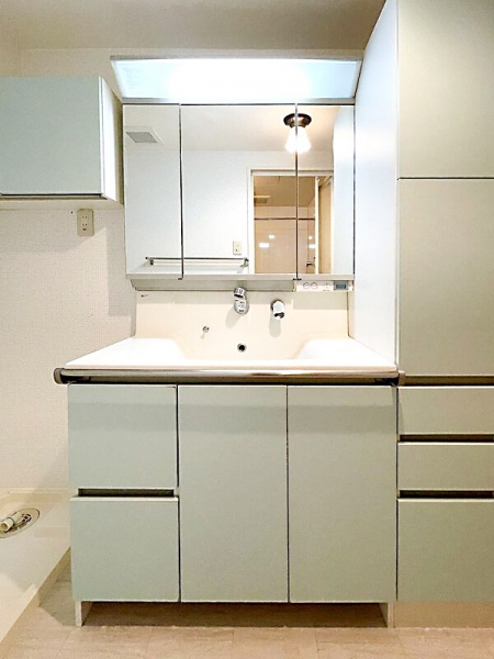 洗面台は、使い勝手の良い三面鏡タイプ。