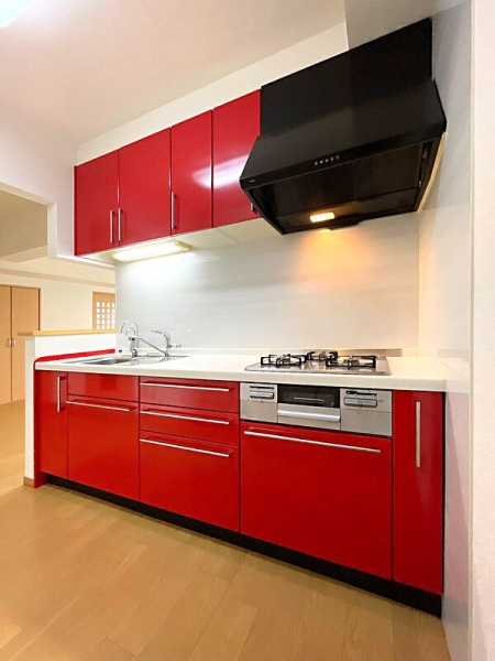 鮮やかな赤が映えるキッチンがあります。