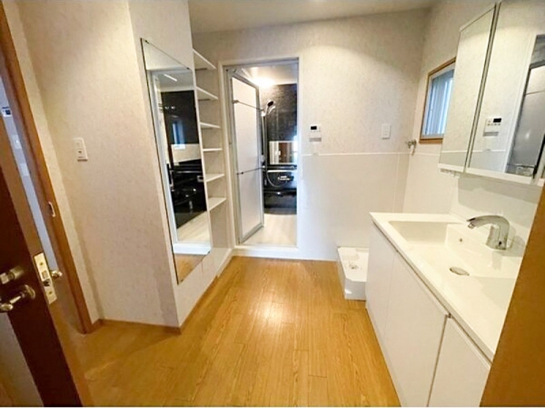 洗面脱衣所は、ホワイト基調の清潔感ある空間。