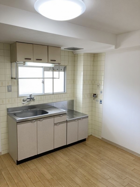 LDK8帖にあるキッチンは、明るい木目調のフロアと