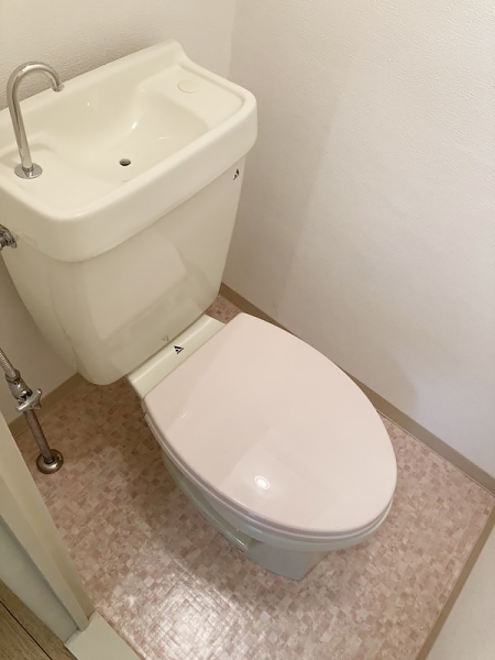 クッションフロア。上部には手洗い付きのタンクがあり