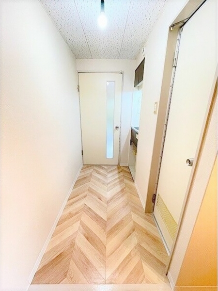 コンパクトながら、ヘリンボーン柄の床がおしゃれなこの1K。