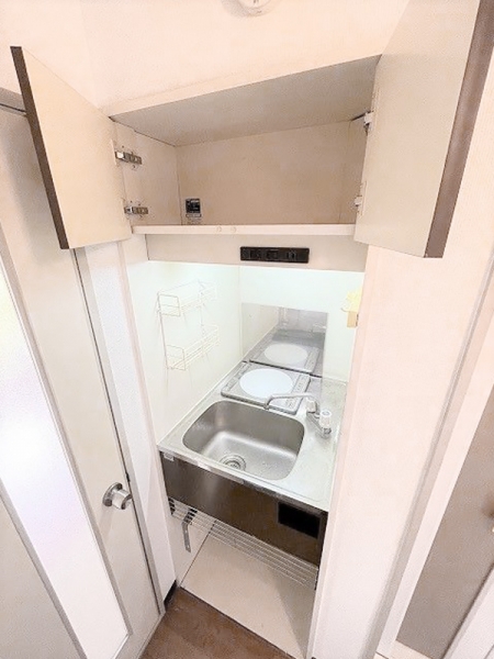 一口コンロやシンク、吊り戸棚が完備されており
