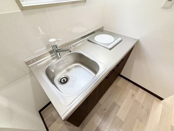 シンクも広めで、一人暮らしには十分なサイズ感です。