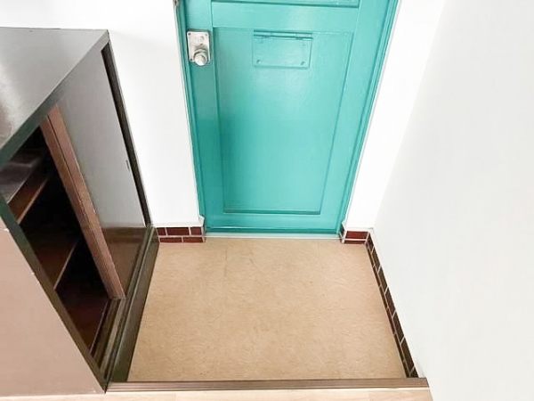 青緑の玄関扉、ピンクなタイルなど