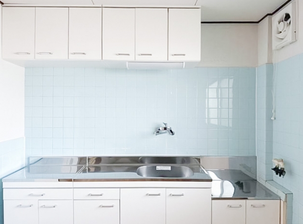 水色タイル×ホワイトなキッチンや