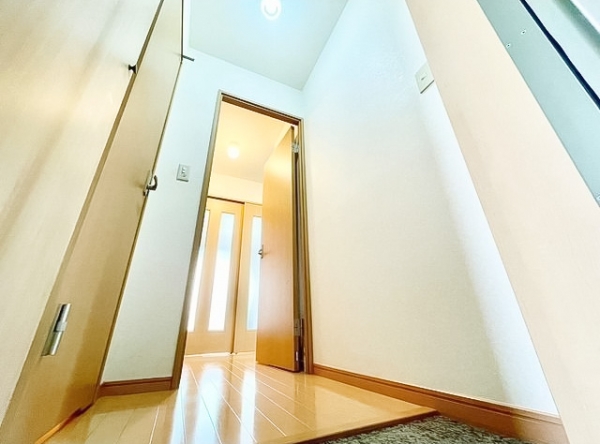 玄関は、ホワイト×木目な清潔感ある内装です。