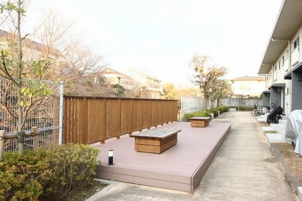 広々とした共用ウッドデッキがあります。
