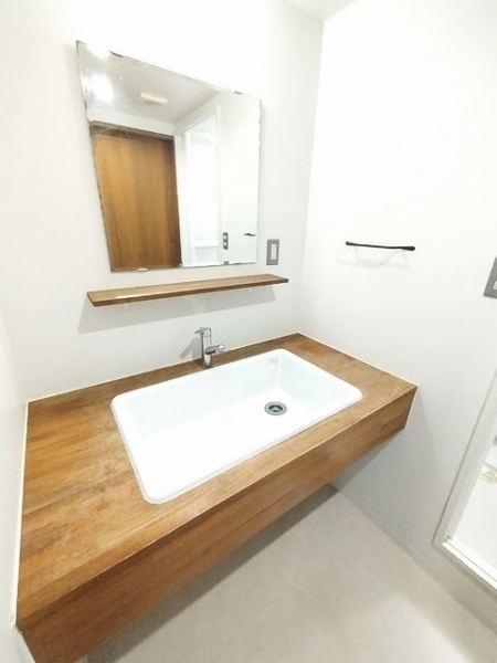 木の温もりを感じるお洒落デザインな洗面台があります。