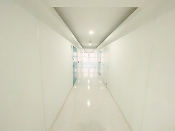 仕上げられ、アクセントの青緑タイルが無機質な中に