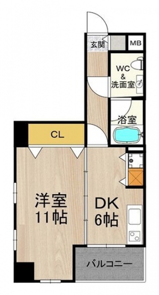 11帖の広々とした洋室と6帖のダイニングキッチン。