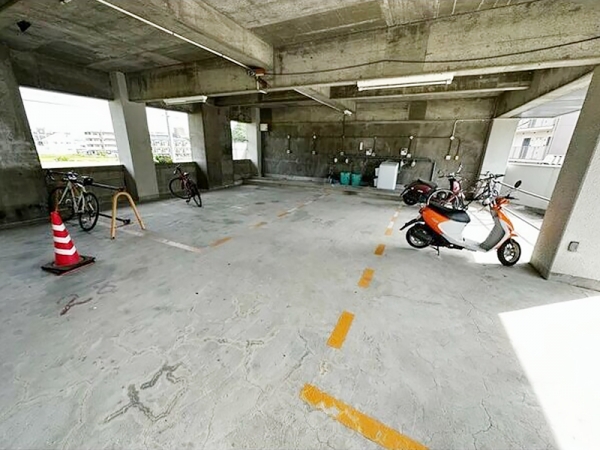 建物下の駐輪場は屋根付きで、バイクや自転車を雨から守れる