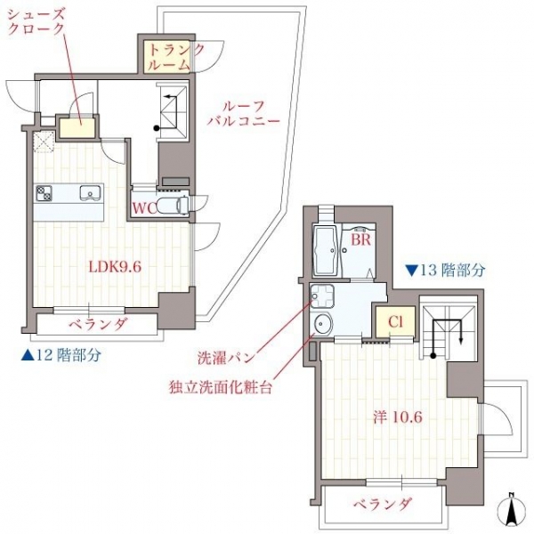 ルーフバルコニー+螺旋階段。メゾネット部屋