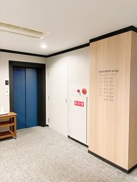 木目の壁にスタイリッシュなフォントでフロア案内があり、
