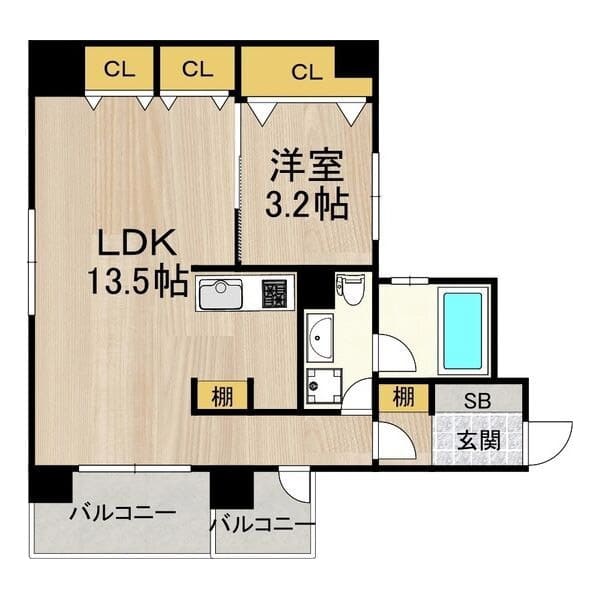 約13.5帖の贅沢な広さが魅力的で、開放感あるお部屋になっています。