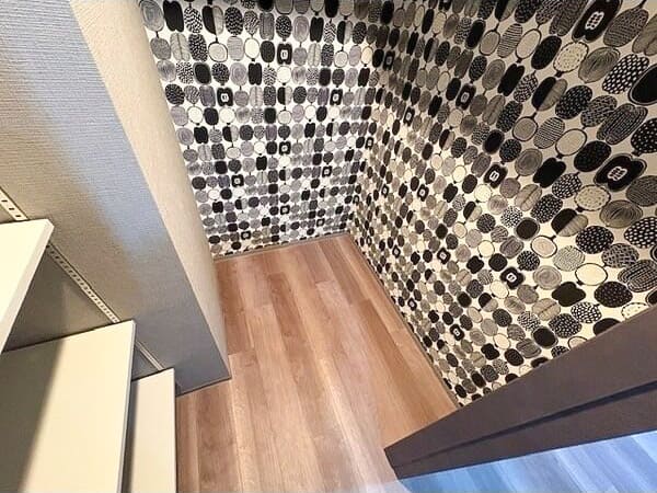 欧風のモダン&モノトーン柄な壁紙が目を引く内装です。