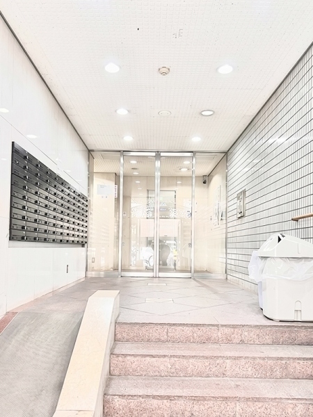 右側はマンションのエントランス部分で、アイアン調の扉が